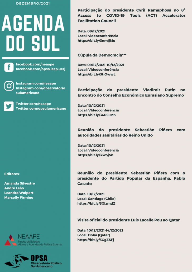 Saiu o novo Agenda do Sul! O Agenda do Sul é uma publicação do Neaape em conjunto com o Observatório Político Sul-Americano (Opsa) que reúne todos os encontros bilaterais e multilaterais dos quais os países do Sul fizeram parte no mês. Este número é referente ao mês de dezembro de 2021!