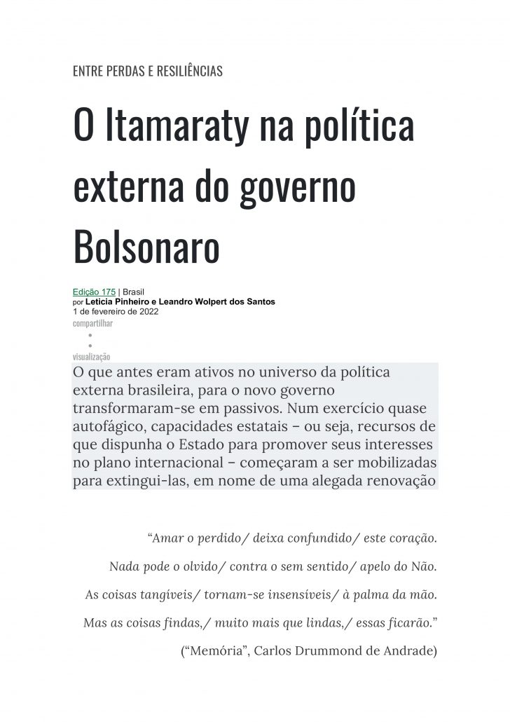 – ENTRE PEDRAS E RESILIÊNCIAS: O Itamaraty na política externa do governo Bolsonaro, de Leticia Pinheiro e Leandro Wolpert dos Santos (disponível aqui).