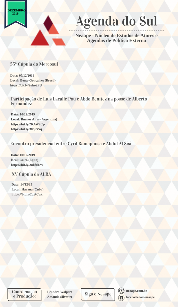 Saiu o novo número do Agenda do Sul! O Agenda do Sul reúne todos os encontros bilaterais e multilaterais dos quais os países do Sul fizeram parte no mês. Este número é referente ao mês de dezembro de 2019!