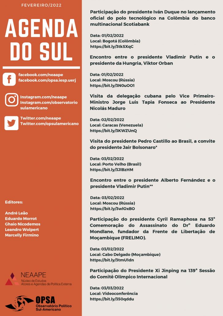 Saiu o novo Agenda do Sul! O Agenda do Sul é uma publicação do Neaape em conjunto com o Observatório Político Sul-Americano (Opsa) que reúne todos os encontros bilaterais e multilaterais dos quais os países do Sul fizeram parte no mês. Este número é referente ao mês de fevereiro de 2022!