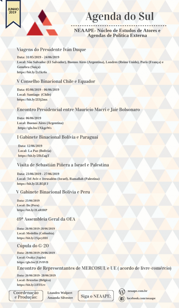 Saiu o novo número do Agenda do Sul! O Agenda do Sul reúne todos os encontros bilaterais e multilaterais dos quais os países do Sul fizeram parte no mês. Este número é referente ao mês de junho de 2019!