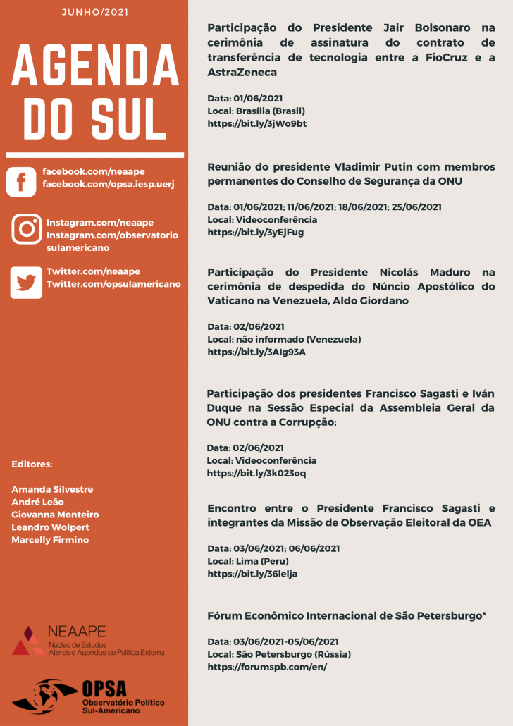 Saiu o novo Agenda do Sul! O Agenda do Sul é uma publicação do Neaape em conjunto com o Observatório Político Sul-Americano (Opsa) que reúne todos os encontros bilaterais e multilaterais dos quais os países do Sul fizeram parte no mês. Este número é referente ao mês de junho de 2021!