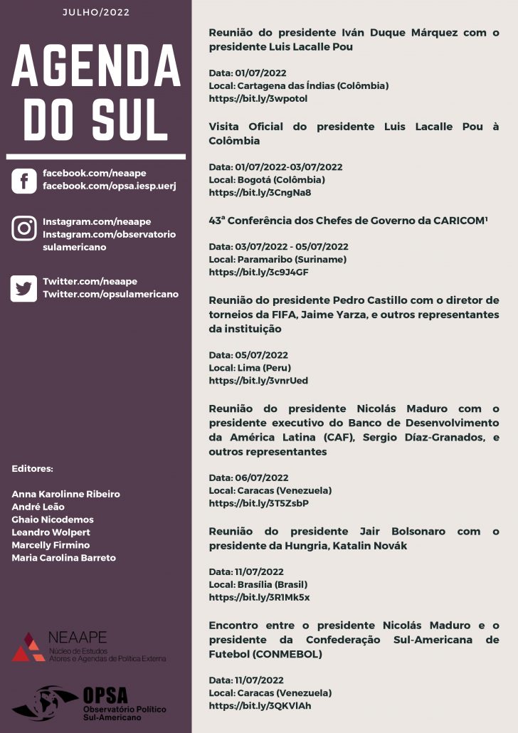 Saiu o novo Agenda do Sul! O Agenda do Sul é uma publicação do Neaape em conjunto com o Observatório Político Sul-Americano (Opsa) que reúne todos os encontros bilaterais e multilaterais dos quais os países do Sul fizeram parte no mês. Este número é referente ao mês de julho de 2022!