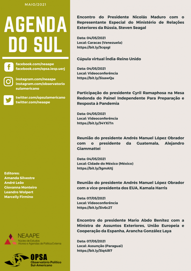 Saiu o novo Agenda do Sul! O Agenda do Sul é uma publicação do Neaape em conjunto com o Observatório Político Sul-Americano (Opsa) que reúne todos os encontros bilaterais e multilaterais dos quais os países do Sul fizeram parte no mês. Este número é referente ao mês de maio de 2021!