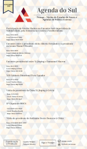 Saiu o novo número do Agenda do Sul! O Agenda do Sul reúne todos os encontros bilaterais e multilaterais dos quais os países do Sul fizeram parte no mês. Este número é referente ao mês de novembro de 2019!